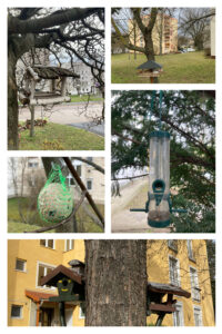 Even though bird feeding as probably the most popular form of human-wildlife interactions globally, actual field surveys about the residents’ bird feeding activity are rare. Here we surveyed bird feeders during the winter of 2021–2022 at 5-5 locations in two cities in Hungary. The density of feeders was higher in Veszprém, a medium-sized city (range: 60.1–206.1/km2) compared to Budapest, the capital city of Hungary (23.3–83.0/km2). The most frequent food types were fat balls, seed mix, and sunflower seeds in both cities. We registered a total of 516 individuals of 24 species on the feeders, and found that the type of the feeder, but not the city, significantly affected both the number of individuals and species visiting bird feeders.