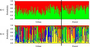 Low genetic differentiation and symmetric migration between urban and forest populations of great tits.