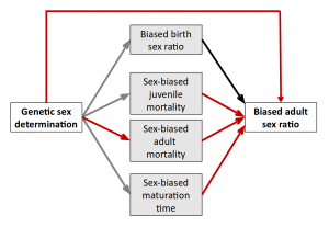 Variation in adult sex ratios in tetrapods is linked to sex chromosomes through mortality differences between males and females.