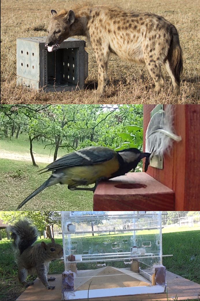 Spotted hyena (Crocuta crocuta), Great tit (Parus major) and Eastern gray squirrel (Sciurus carolinensis) solving a cognitive task. Photo credits: Lily Johnson-Ulrich (top), Pizza Ka Yee Chow (bottom).